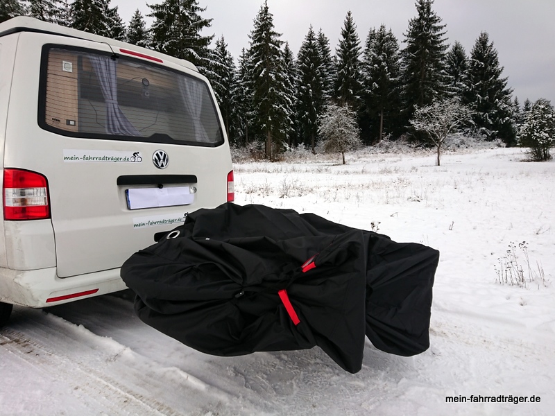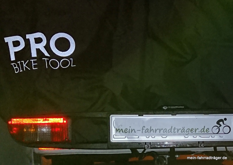 Die stabile Verarbeitung und das durchdachte Design haben uns gefallen. Die Nähte sind versiegelt und die Hülle ist aus einem soliden wasserfesten Material. Dieses Material erinnert an eine Zelthaut und wirkt robust genug, dass es nicht gleich im Fahrtwind zerreißt. Die Größe der Schutzhülle ist wirklich gut bemessen, sodass beim verwendeten Zweierfahrradträger Westfalia BC60 vermutlich auch das Cover der Größe XL ausgereicht hätte. Trotz verwendetem Bike Cover bleiben die Abklappfunktion des Fahrradträgers verwendbar. Und das Cover ist auch so geschnitten, dass das Zeltmaterial eigentlich nicht die Beleuchtungseinrichtung verdecken kann.